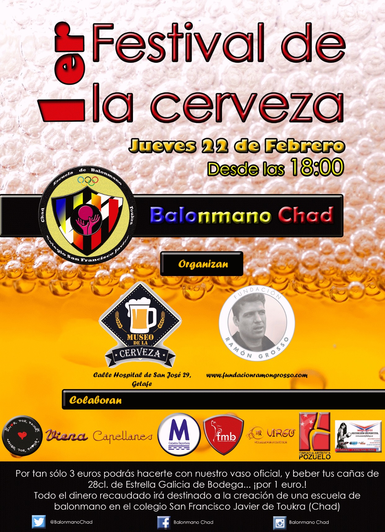 La 1ª Fiesta de la cerveza tendrá lugar en el local del Museo de la Cerveza, en la calle Hospital de San José, 29, en Getafe a partir de las 18:00h. Los asistentes podrán adquirir el vaso oficial por 3€ y cañas de 8 cl de estrella galicia de bodega por 1€. Todo el dinero que se recaude, se destinará a la creación de una escuela de balonmano en el colegio San Francisco Javier de Toukra, en Chad.