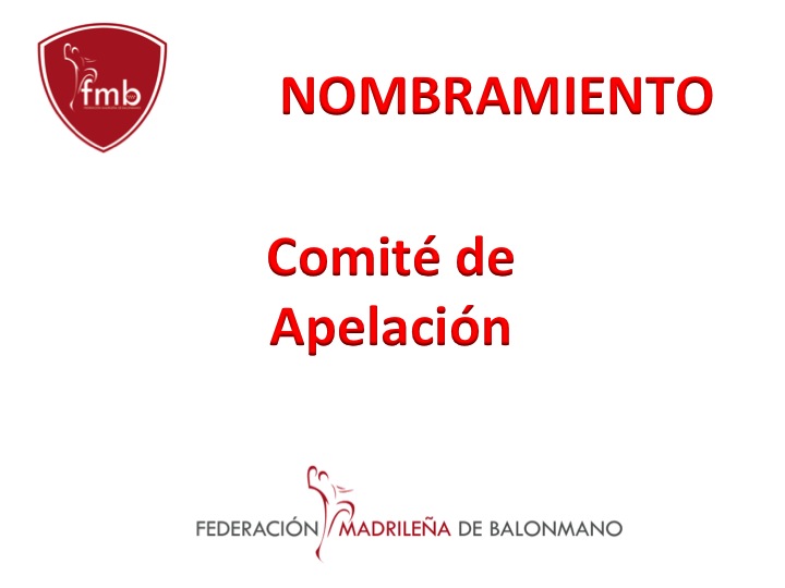 Con fecha 2 de Septiembre de 2013 y por parte del Presidente de la Federación Madrileña de Balonmano, han sido designados los miembros del Comité de Apelación. Del mismo modo y tras reunión del mismo, este ha quedado constituido del siguiente modo: