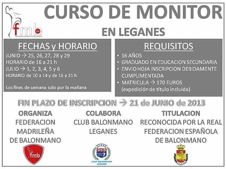 Se hace pública la convocatoria para el curso de Monitor que organiza la Federación Madrileña de Balonmano, en la localidad de Leganés, con la colaboración del Club Balonmano Leganés.