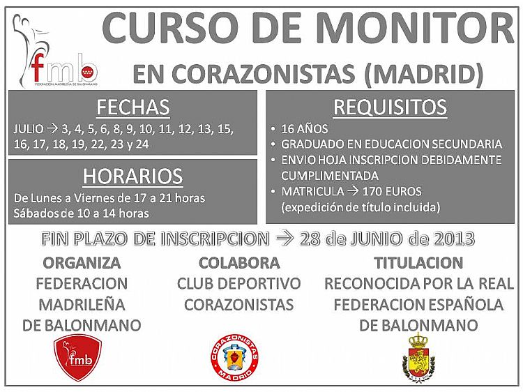 Se hace pública la convocatoria para el curso de Monitor que organiza la Federación Madrileña de Balonmano, en Madrid, con la colaboración del Club Deportivo Corazonistas.