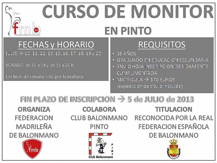 Se hace pública la convocatoria para el curso de Monitor que organiza la Federación Madrileña de Balonmano, en Pinto, con la colaboración del Club Balonmano Pinto.