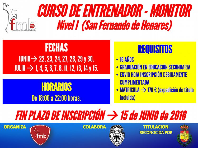 Se hace oficial la convocatoria del curso de Entrenador – Monitor (Nivel I) que realiza la Federación Madrileña de Balonmano con la colaboración del Club Balonmano San Fernando de Henares.