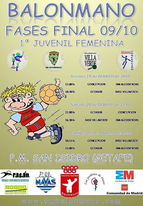 El próximo fin de semana se disputará la priemra fase final de las previstas para la temporada 2009/2010. Corresponde a la categoría 1ª Juvenil Femenina. Se disputará en el Pabellón San Isidro de Getafe, con los siguientes horarios: