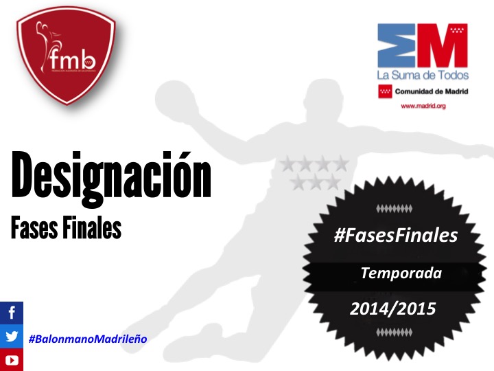 Concluido el plazo de inscripción para las Fases Finales de la presente temporada, la Federación Madrileña de Balonmano hace públicas las sedes de las categorías: primera infantil, cadete y juvenil masculino y femenino que comienzan el 20 de Marzo y llegan a su fin el 10 de Mayo.