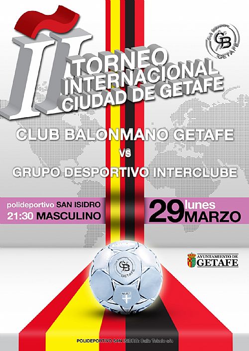 El Lunes 29 de Marzo a las 21:30 horas en el Pabellón San Isidro de Getafe se disputará el II ENCUENTRO INTERNACIONAL BALONMANO GETAFE, que enfrentará a los equipos CB GETAFE y CLUB DESPORTIVO INTERCLUBE DE ANGOLA, equipo que se encuentra en la Comunidad de Madrid preparando la Copa de Africa.