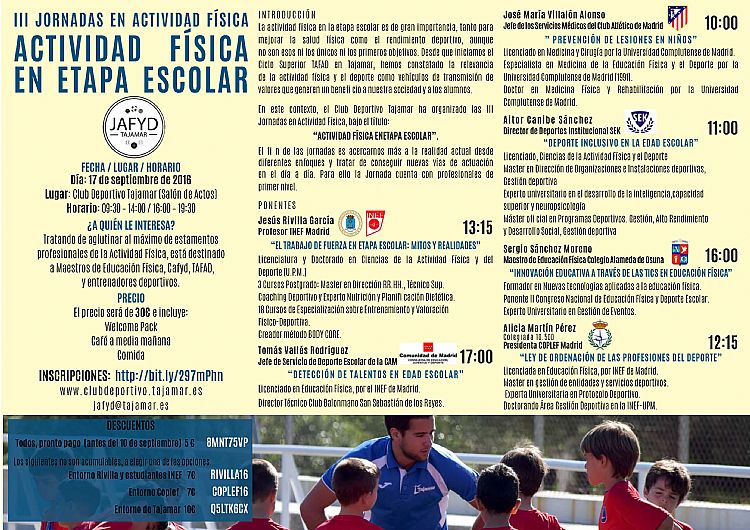 ¿Quieres hacer del deporte una profesión? Entonces te interesará asistir a las III Jornadas que ha organizado el Club Deportivo Tajamar sobre la “Actividad Física en la Etapa Escolar”. Una jornada dirigida principalmente a maestros en educación física, Cafyd, TAFAD y entrenadores deportivos.