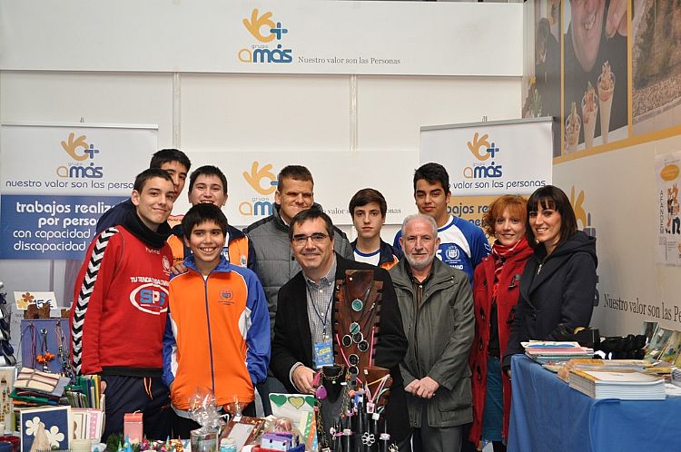En la fotografía, tomada en el I Mercado Solidario de Leganés, el presidente de la asociación ADFYPSE, Jesús Rodríguez junto al vicepresidente del Club Balonmano Leganés, Fernando Casa, posan con miembros de ambos colectivos en el stand de AMAS.