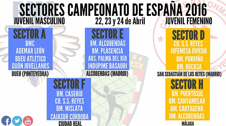 El Departamento de Competiciones de la Real Federación Española de Balonmano ha hecho publico el reparto de sectores de la Fase Zonal de los Campeonatos Estatales Juvenil Masculino y Femenino, que se disputarán del 22 al 24 de Abril.