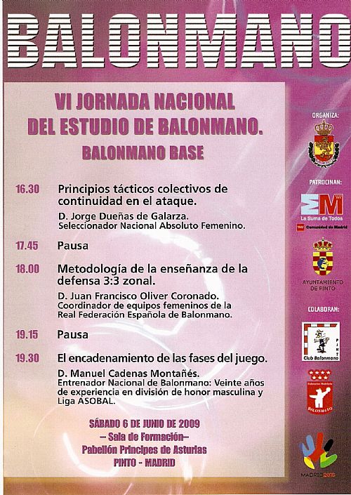 El próximo sábado día 6 de Junio de 2009 se celebrará la VI JORNADA NACIONAL DEL ESTUDIO DE BALONMANO, que tendrán lugar en el Pabellón príncipes de Asturias de Pinto.