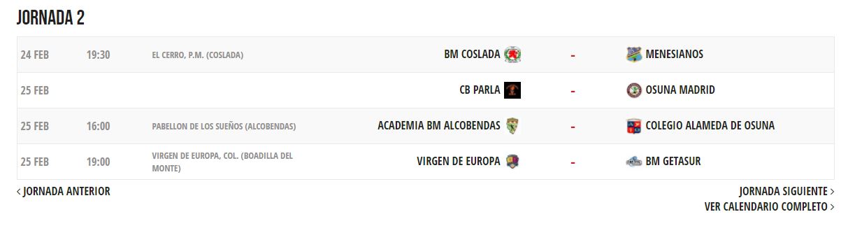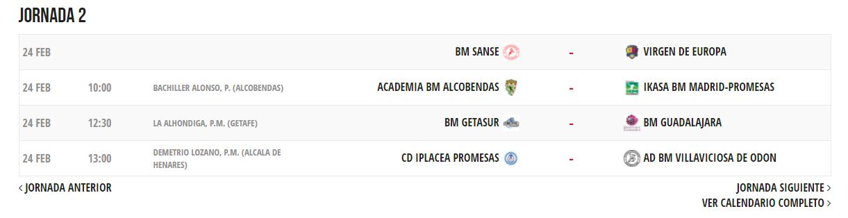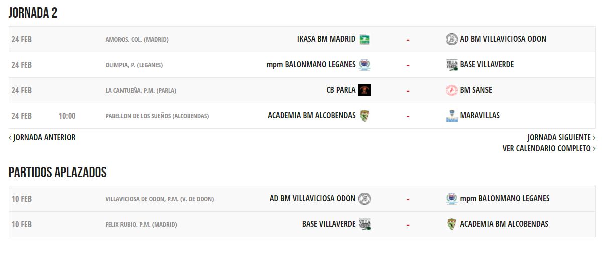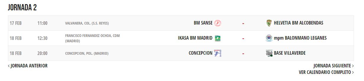 Seis equipos luchan por ganar la competición en el primer grupo. A la cabeza está BM Sanse con 10 puntos e invictos con 5 victorias. Detrás le sigue el BM Base Villaverde con 7, el Academia BM Alcobendas con 5, el Ikasa con 4 y para cerrar el BM Concepción con 2 y con 0 puntos el mpm Leganés. Así será la siguiente jornada: